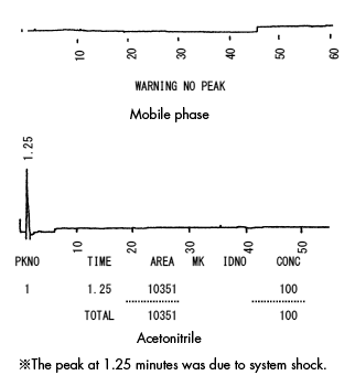 Acetonitrile and an HPLC mobile phase (shown below) were placed separately into sample cups, and the cups were then sealed and left to stand for 40 hours. The contents of each cup were then analyzed to verify the presence or absence of eluted components (see chromatograms on the right).