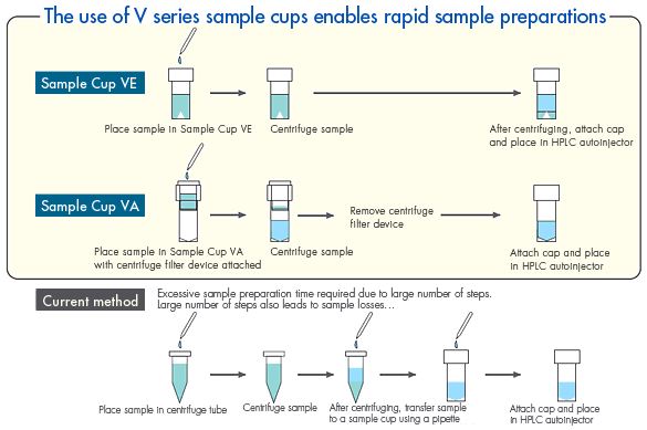 Centrifuge filter devices * can be attached to these sample cups. After filtration of samples using a centrifuge, these sample cups can be used directly in HPLC autosamplers without the need for transferring samples to separate vessels.