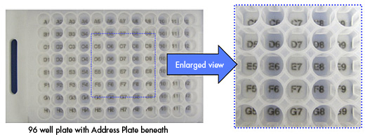 - Address Plates are placed beneath 96 well plates when performing manual dispensing. Addresses are clearly displayed at the bottom of wells, helping to prevent dispension of different solutions into the same well.