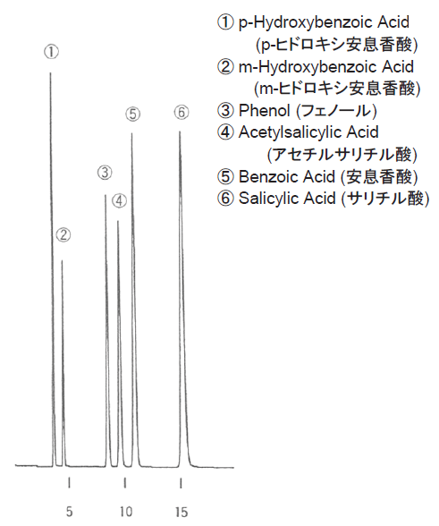 - p-Hydroxybenzoic acid , m-Hydroxybenzoic acid , Phenol , Acetylsalicylic acid , Benzoic acid , Salicylic acid