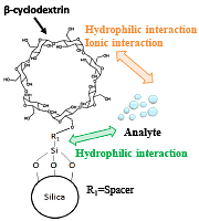 ULTRON AF-HILIC-CD series is a HILIC mode column in which β-cyclodextrin (※) is chemically bonded to a silica stationary phase via a spacer. The selectivity towards molecular structure is high, and also shows high resolution analysis for structural analogues and structural isomers of acidic, basic and neutral compounds.