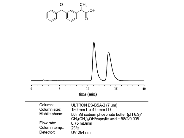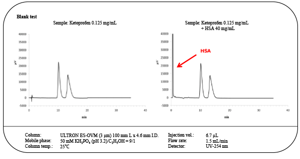 It is possible to separate optical isomers of Ketoprofen in HSA-containing samples even on direct injection of untreated samples without adverse effects due to HSA. In addition, as the ovomucoid stationary phase is a trypsin inhibitor, adverse effects due to samples containing trypsin are also kept to a minimum, making it suitable for analyses of biological samples.