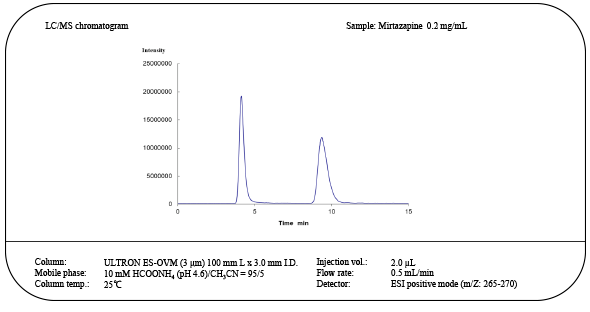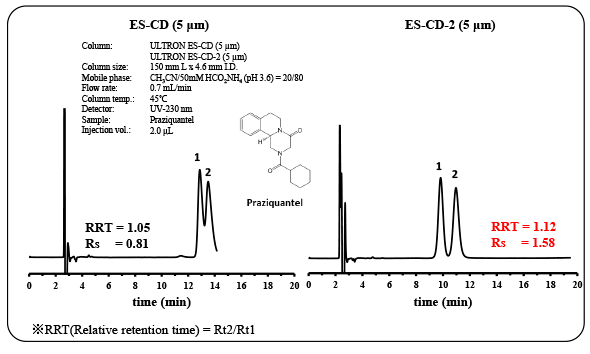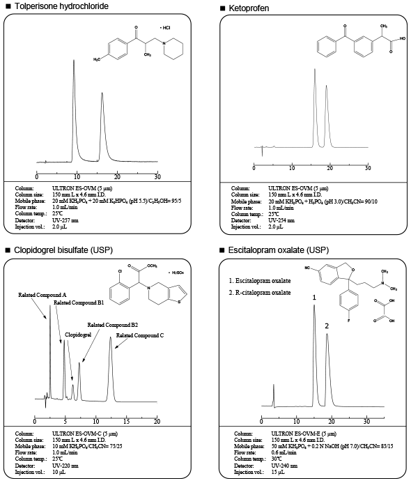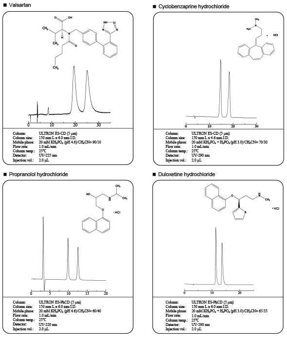 The ULTRON ES series consists of columns designed specifically for chiral separations that employ chemically immobilized protein (ULTRON ES-OVM, ULTRON ES-PEPSIN, ULTRON ES-BSA) and cyclodextrin (ULTRON ES-CD, ULTRON ES-PhCD) stationary phases.