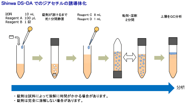 酒類、飲料中のジアセチルを誘導体化し、ガスクロマトグラフィーで測定するための試薬キットです。