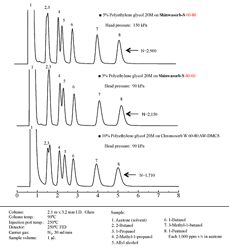 Shinwasorb-S に Polyethylene Glycol 20M を5%コーティングした充填カラム(長さ 2.1m, 内径 3.2 mm ガラス)の低級アルコール分離例です。Chromosorb-W AW-DMCS 60/80 mesh の充填カラムと比較しました。
