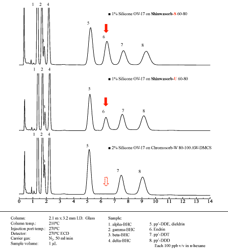 Shinwasorb-S に Silicone OV-17 を1%コーティングした充填カラム(長さ 2.1 m, 内径 3.2 mm ガラス)の有機塩素系殺虫剤分離例です。Shinwasorb-U およびChromosorb-W AW-DMCS の充填カラムと比較しました。