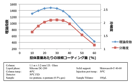 次のグラフは液相(Silicone DC-200)のコーティング量を変化させ、それぞれの充填カラム (1.1m x 3.2mm I.D. のガラスカラム)でイソペンタンとノルマルペンタンの分離度、およびノルマルペンタンの理論段数を測定したものです。