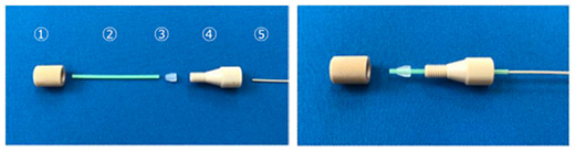 ① 1/16” PEEK密栓 ② 1/16” O.D. x 0.35 mm I.D. x 40 mm FEPスリーブ ③ 1/16” CTFEフェラル ④ 1/16” PEEKフィッティング ⑤ 1/32” PEEKカラムジャケット ・ バルコバルブ(Thermo Fisher Scientific)に対応しています。 ・ カラムをシステムに取り付ける際は、0.6 N・mを目安として下さい。 |