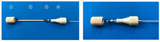 ① 1/16” PEEK密栓 ② 1/16” O.D. x 0.41 mm I.D. x 40 mm PEEKスリーブ ③ 1/16” PEEK高耐圧フェルール (ステンレスとPEEKブレンドポリマーのハイブリッド型) ④ 1/16” PEEKフィッティング ・ バルコバルブ(Thermo Fisher Scientific)に対応しています。 ・ フェラルをかしめる際は、トルク1.4 N・mを目安として下さい。 ・ カラムをシステムに取り付ける際は、1.1 N・mを目安として下さい。 |