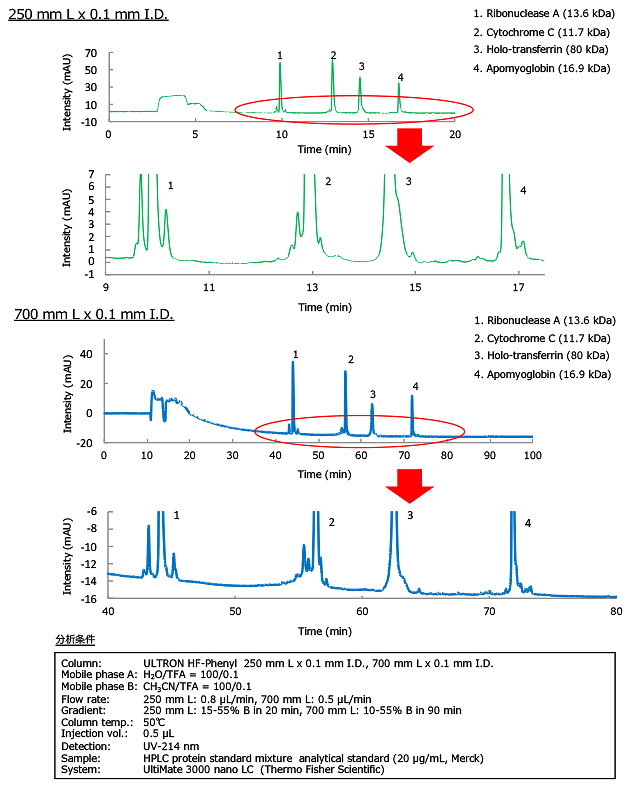 ULTRON HF-Phenyl カラム長さの違いによる分離比較 (タンパク質混合物)