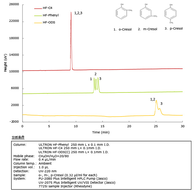 ULTRON HF-Phenylは、生体分子の分析を行う水の豊富な移動相条件においてクレゾールの位置異性体を